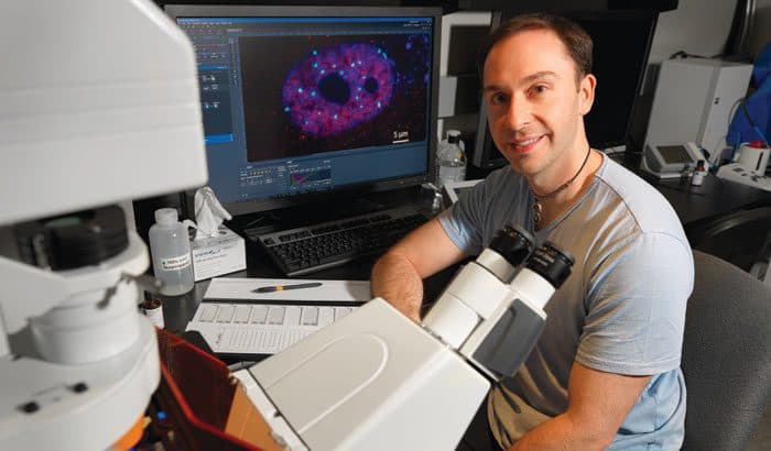 Down the hall, a few doors from Goodarzi’s office, normal cells and cancer cells sourced from biopsies and packaged in artificial blood are growing in four incubators, each the size of a mini-refrigerator. Goodarzi and his team then analyze the cells at a sub-nuclear level using two microscopes that Goodarzi received in association with his national research chair.